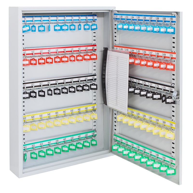 - ARMADIO DI SICUREZZA: realizzato in acciaio con capacità per 100 chiavi. Include i portachiavi in plastica con etichette per identificare le chiavi, nonché una tasca portadocumenti interna.
