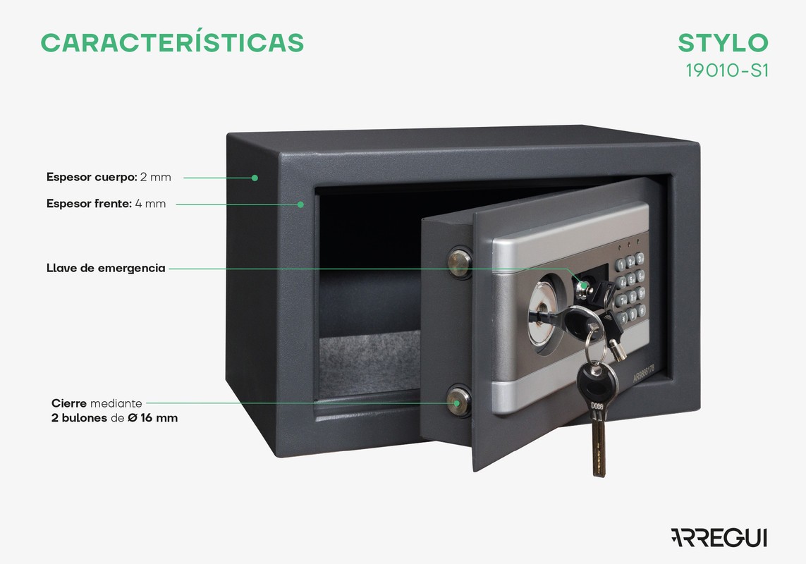 Dispone di una serratura aggiuntiva per l'apertura con chiave di emergenza (fornita) per poter aprire la cassaforte in caso di batterie scariche, di dimenticanza del codice o di guasto della tastiera. Viene utilizzata in combinazione con la chiave dell'utente.