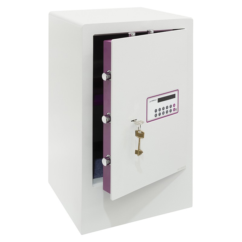 - Serratura elettronica con tastierino più serratura a chiave (doppia sicurezza). Una volta inserito il codice corretto, la cassaforte si può aprire inserendo e girando la chiave.