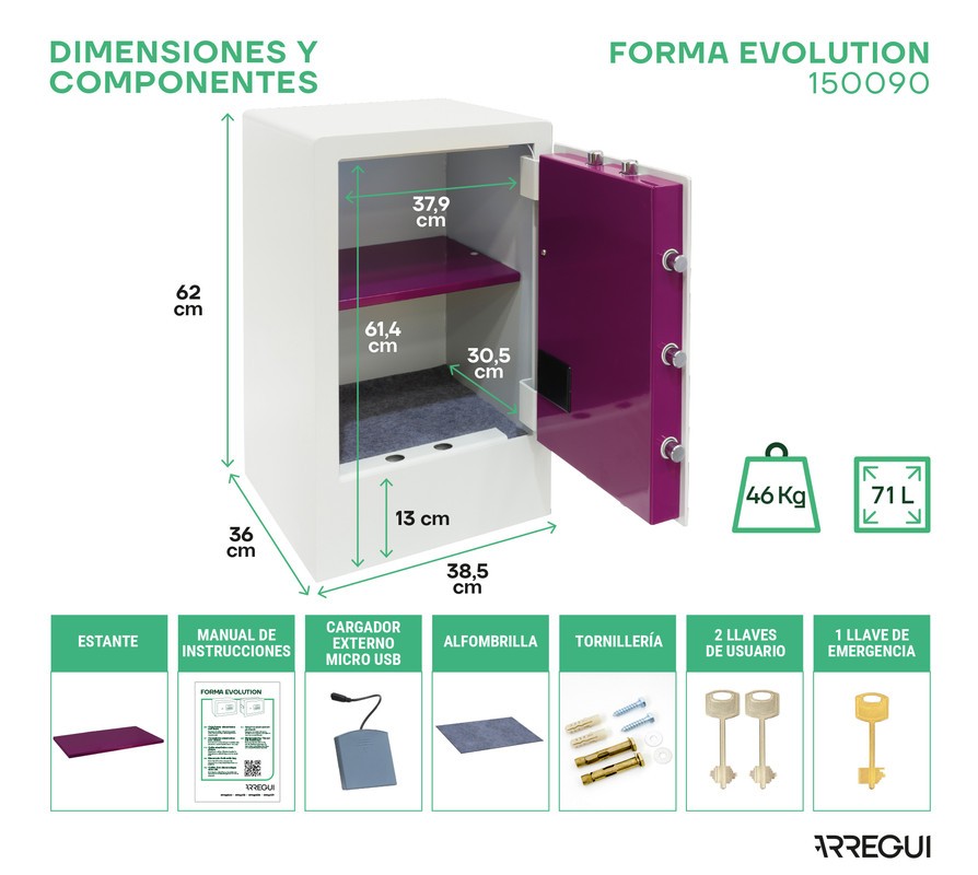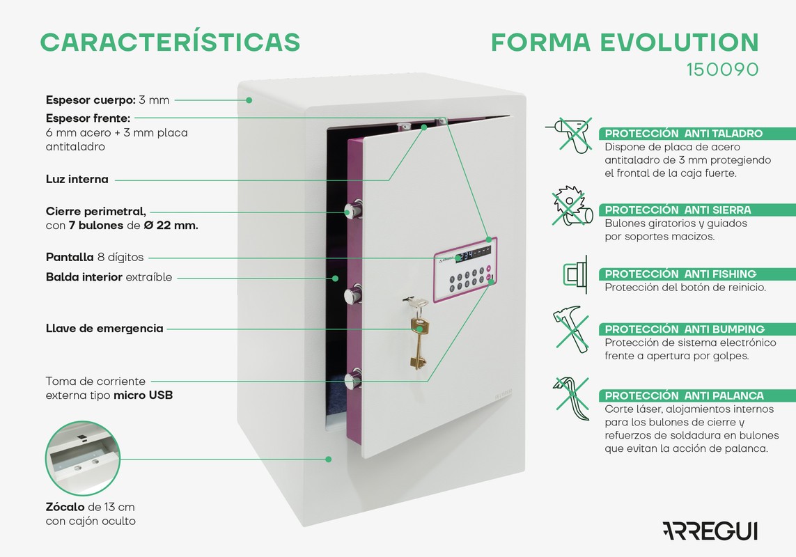 Forma Evolution Elettronica + Chiave - Cassaforte da sovrapporre con apertura a doppia sicurezza con tastiera elettronica più chiave, frontale da 6+3 mm, schermo digitale e zoccolo da 13 cm.