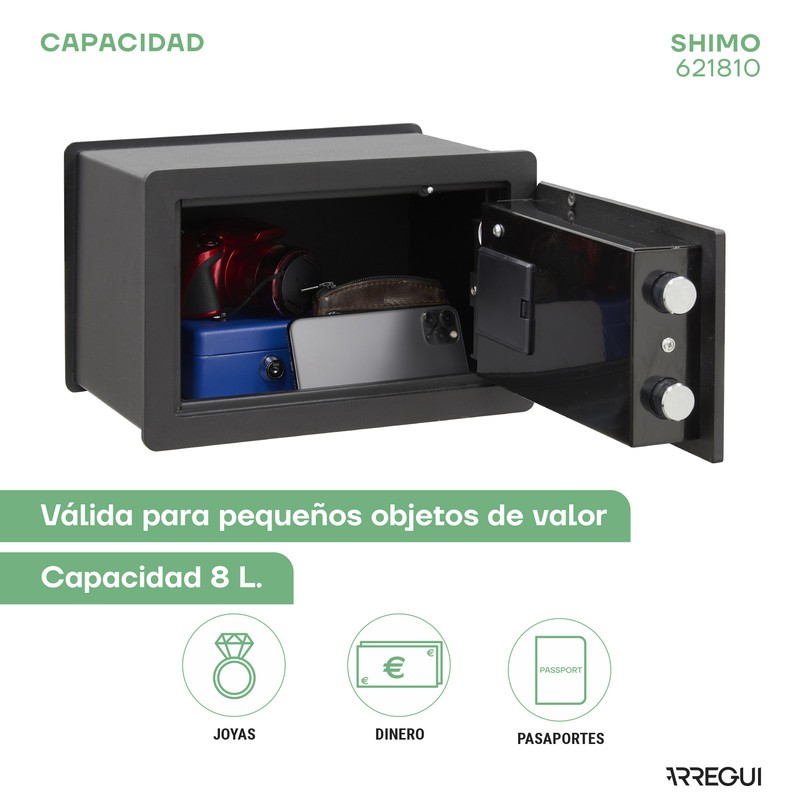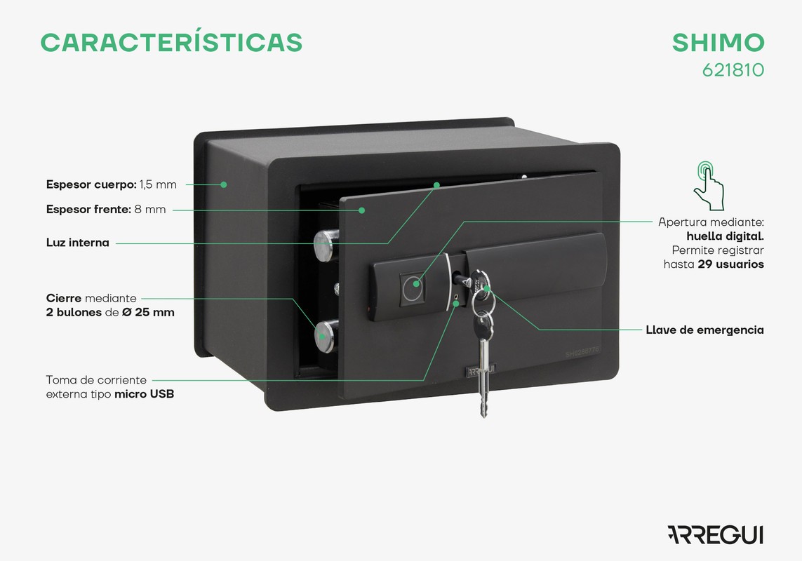 - Con luce led verde nel lettore di impronte digitali che aiuta nell'uso della cassaforte.