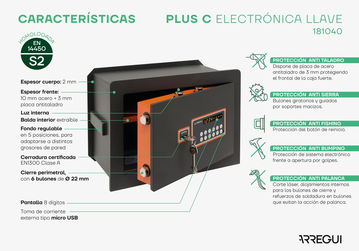 Plus C Elettronica + Chiave - Cassaforte a incasso a muro con apertura a doppia sicurezza con tastiera elettronica più chiave, certificata Grado S2, frontale di 10+3 mm e schermo digitale