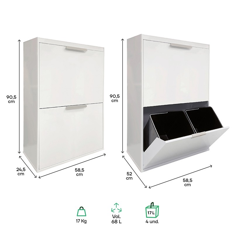 - CON SECCHIETTI REMOVIBILI: include 4 secchi di plastica da 17 litri ciascuno. Ideali per sacchetti della spazzatura da 20 o 30 L (i più comuni). I secchi hanno maniglie per facilitarne l'estrazione e la pulizia.