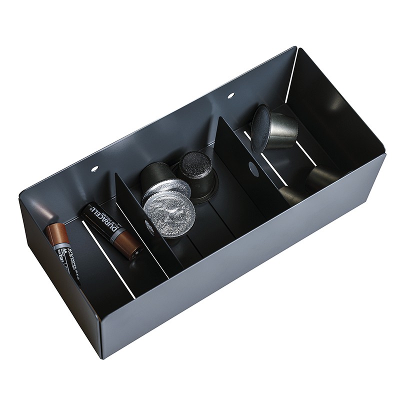 Il prodotto include una piastra separatrice interna a forma di "U" che è rimovibile e mobile. Questa piastra si incastra nella scatola organizzatrice attraverso diverse scanalature presenti nella base, potendo così essere posizionata in diverse posizioni. A seconda della posizione in cui viene collocata la piastra separatrice, si generano fino a 3 scomparti diversi, che faciliteranno l'ordine degli articoli da collocare all'interno.