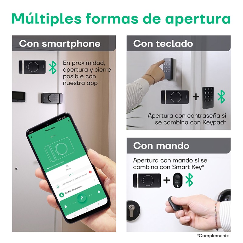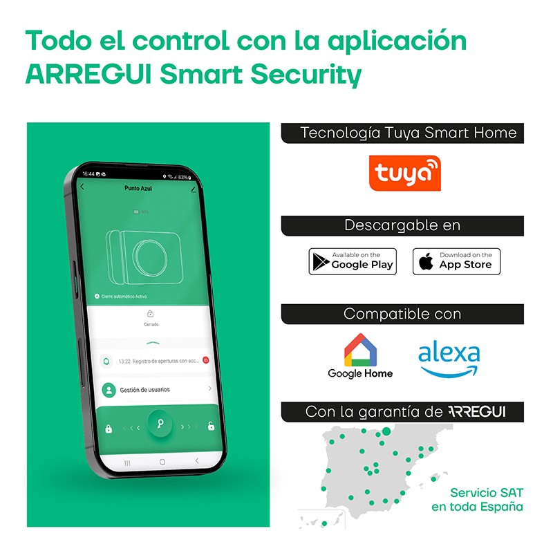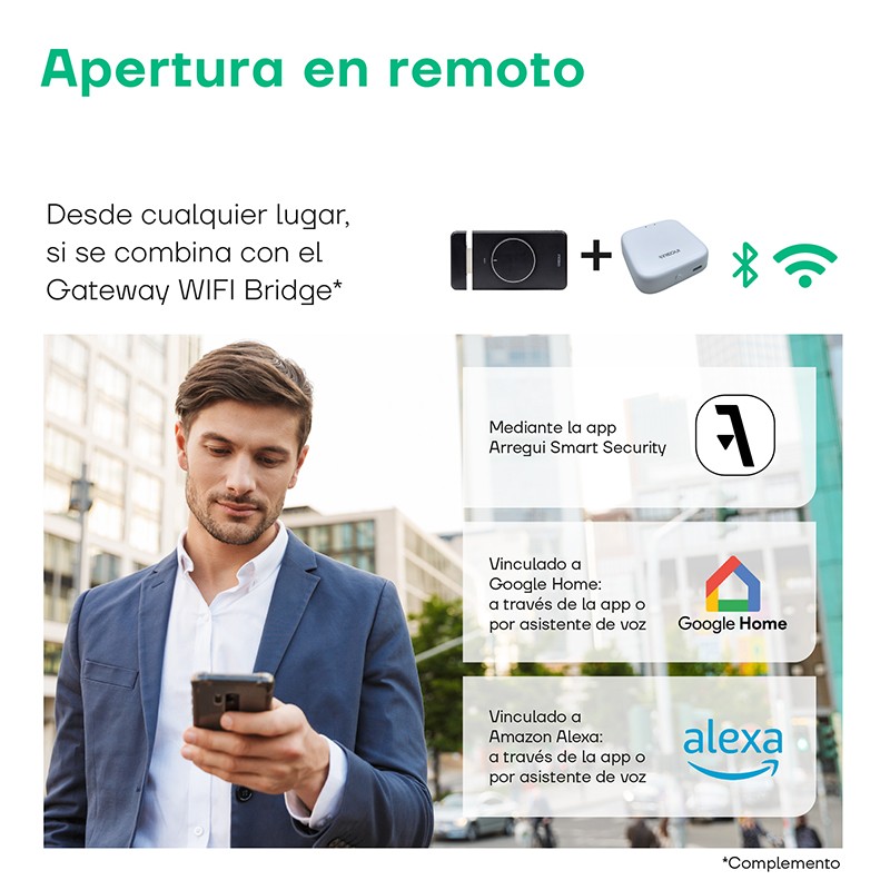 - APERTURA INTELLIGENTE: tramite l'app Arregui Security sul cellulare o con il telecomando (Smart Key, da acquistare a parte).